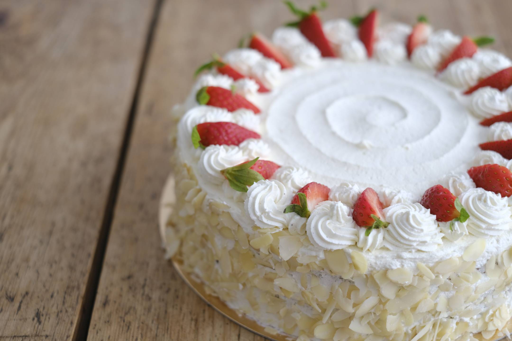 Mandelkuchen wird mit einer fluffigen weißen Schokoladencreme und frischen Erdbeeren gefüllt.