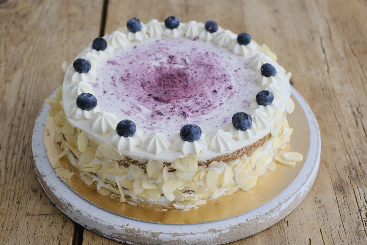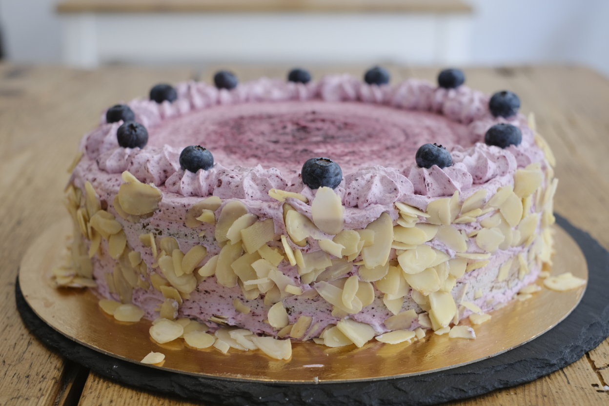 Mandelkuchen mit eingebackenen Heidelbeeren wird mit Heidelbeerröster bestrichen und mit weißer Schokoldaencreme gefüllt.