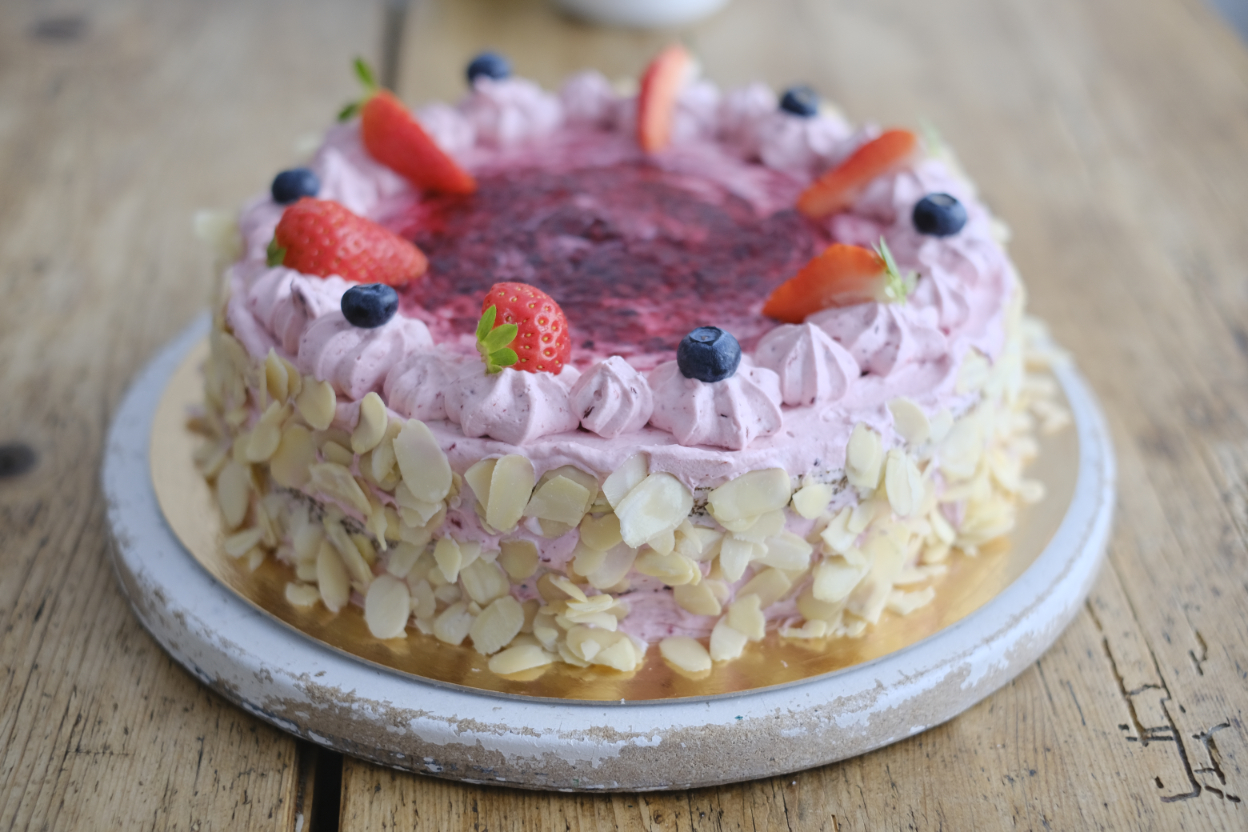 Saftiger Mandelkuchen mit eingebackenen Waldbeeren wird mit Waldbeercreme gefüllt und reichlich verziert.