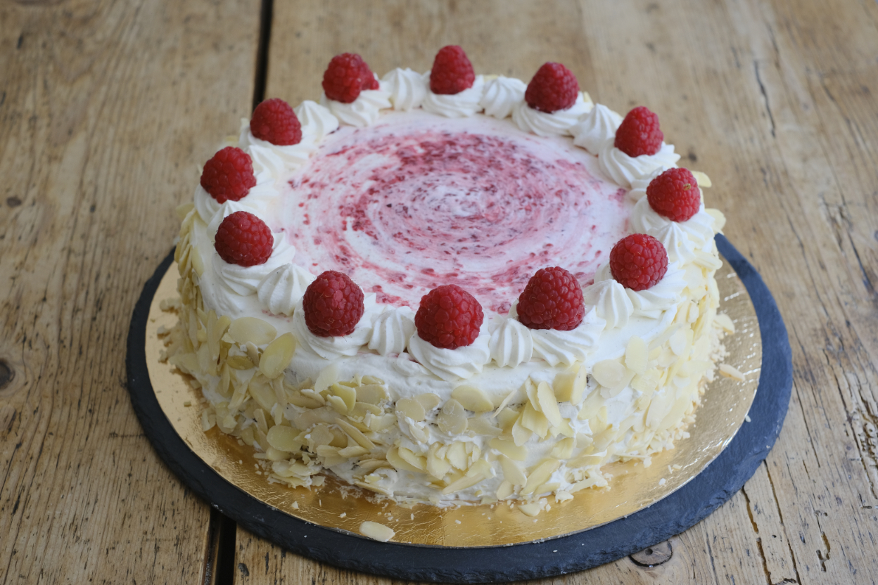 Mandelkuchen mit eingebackenen Himbeeren wird mit Himbeercreme gefüllt.