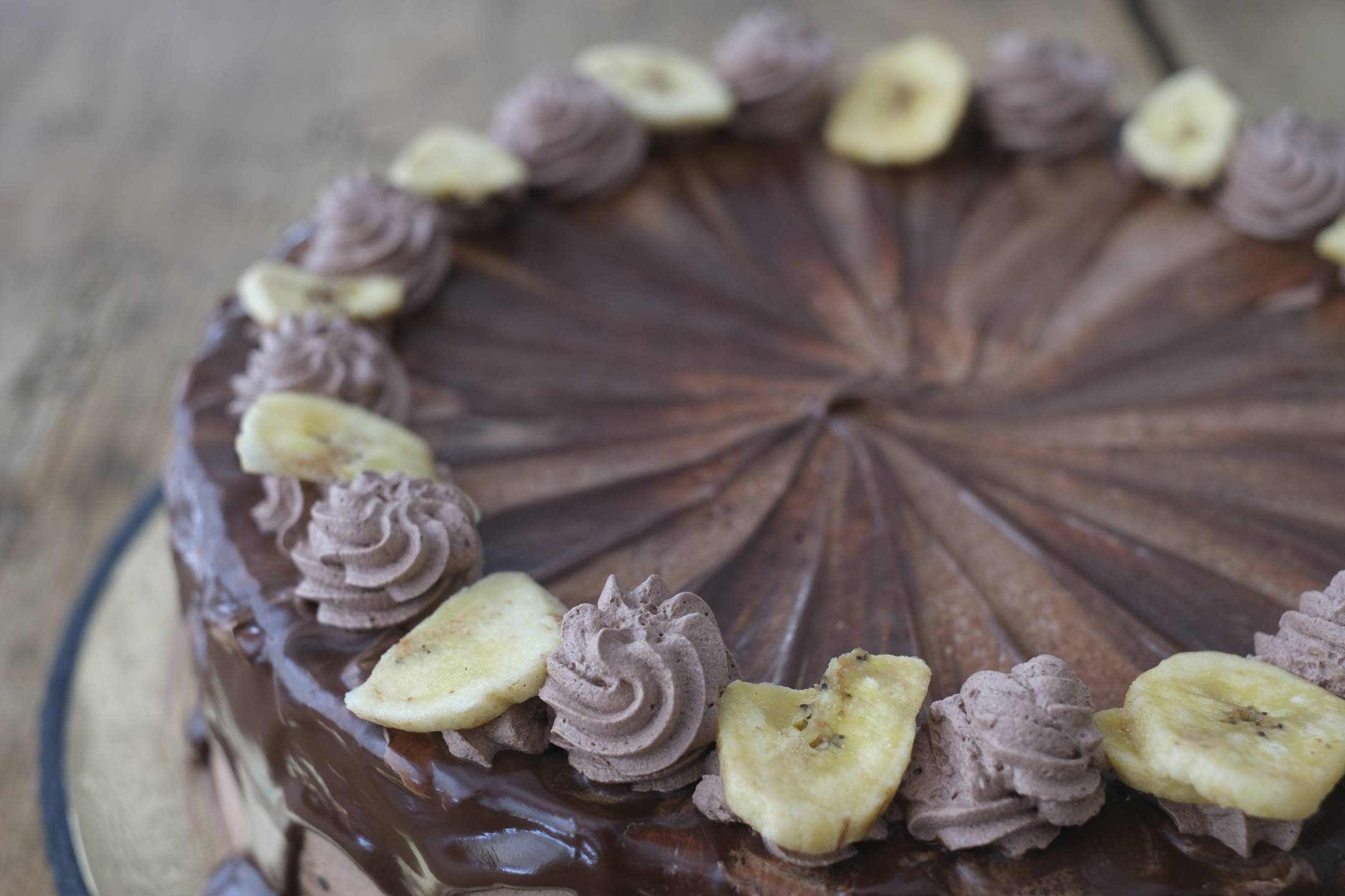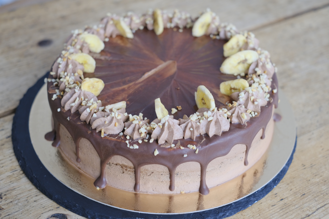 Bananenteigbasis mit eingebackenen Schoko- und Bananenstückchen. Dazu noch frische Bananenhälften bedeckt mit Schokoladencreme.