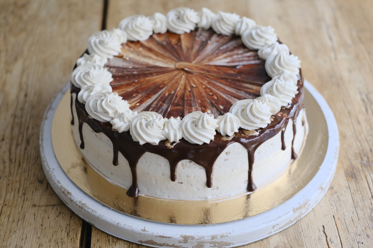 Unser beliebter Schokoladenkuchen wird bei dieser Torte mit einer vollmundigen Nougatcreme gefüllt und mit Schokodriprand und Haselnüssen verziert.