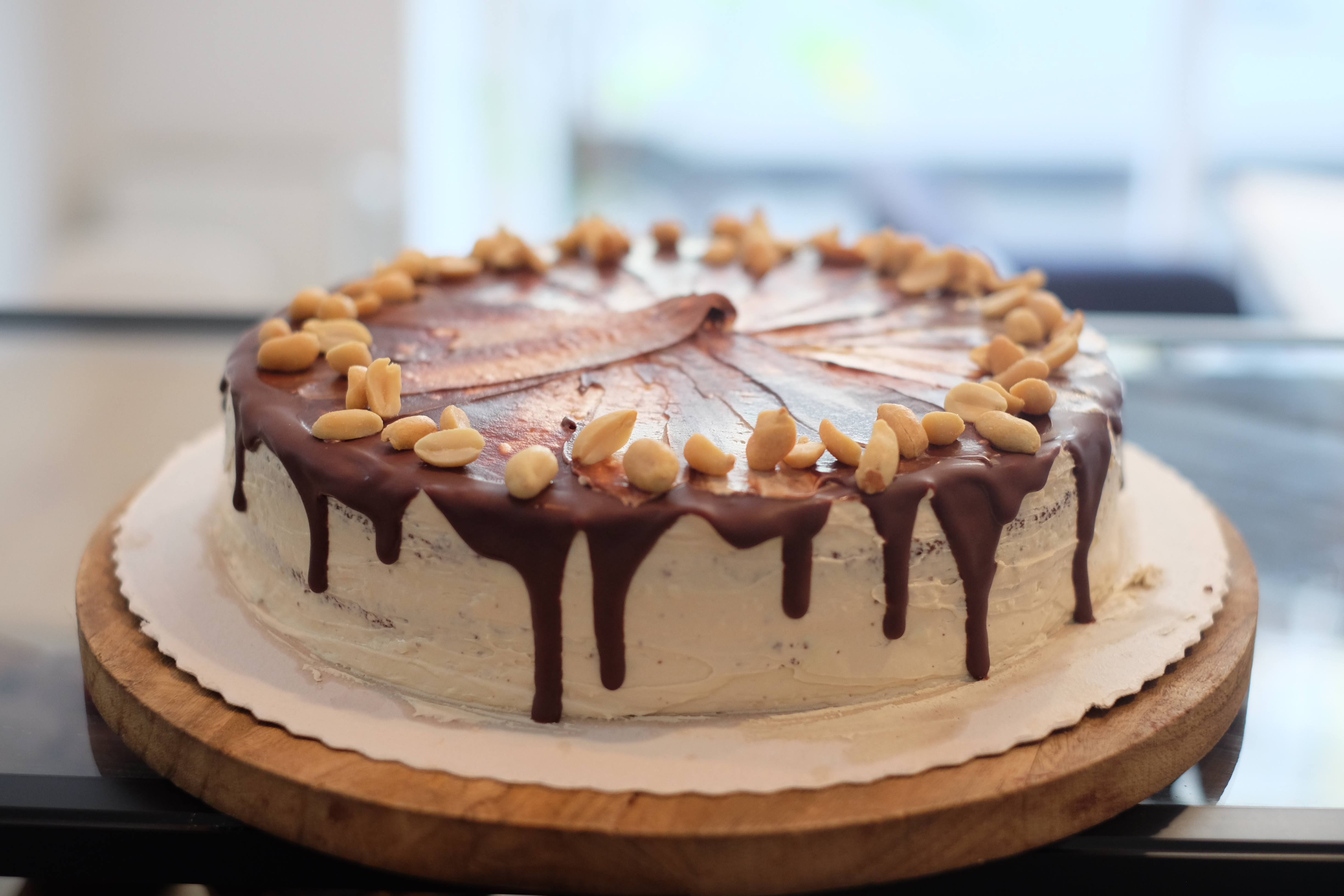 Schokoladenkuchen gefüllt und bedeckt mit einer cremigen Schicht aus cremiger Erdnusscreme mit Schokodrip und gesalzenen Erdnüssen