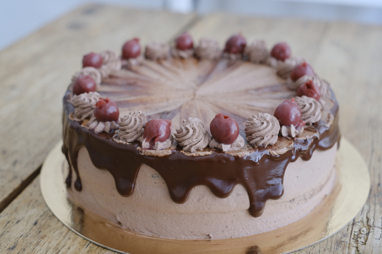 Schokoteig mit eingebackenen Weichseln wird mit Weichselröster und vollmundiger Schokoladencreme gefüllt.