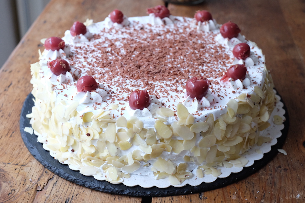Saftiger Schokoteig wird mit Weichselröster bestrichen und mit fluffiger Vanillecreme gefüllt und umhüllt.